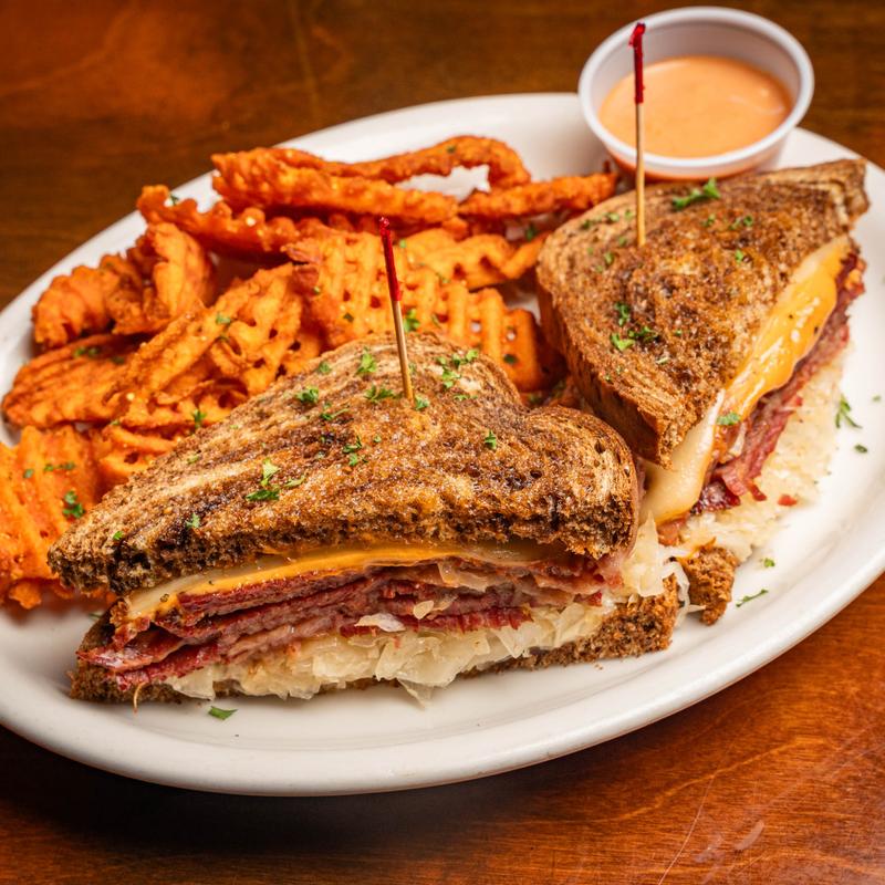 House-made corned beef, Swiss, sauerkraut, and Marie Rose on grilled marbled rye