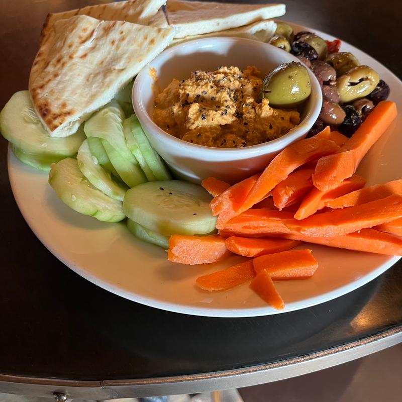 Hummus, carrots, celery, cucumbers, red & green peppers, mixed Mediterranean olives, and grilled pita bread