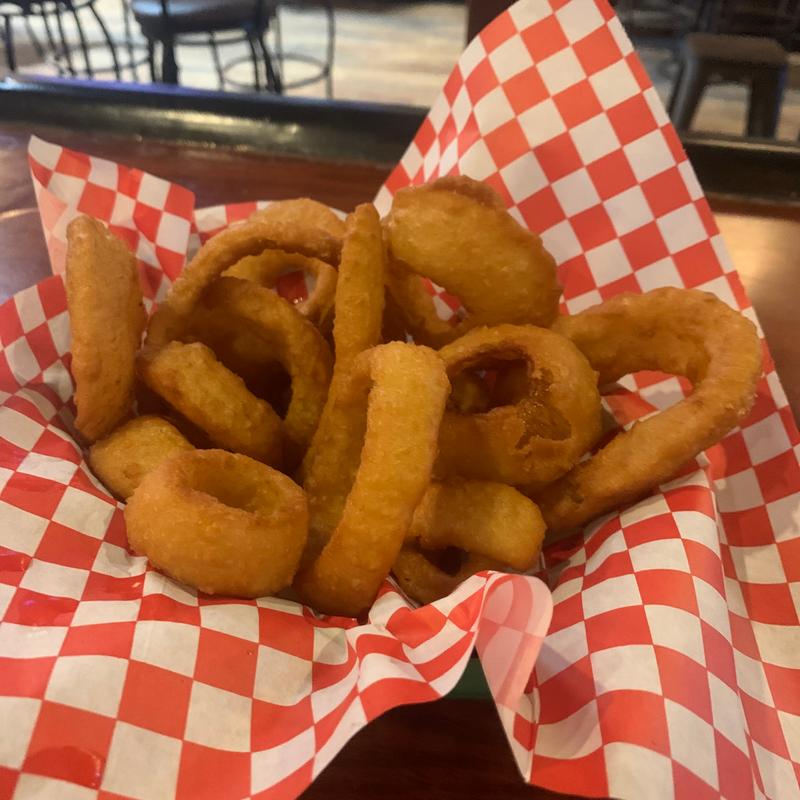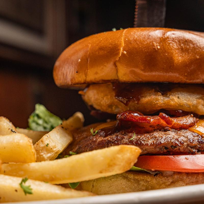 Bacon, hand battered onion ring, cheddar, and BBQ sauce