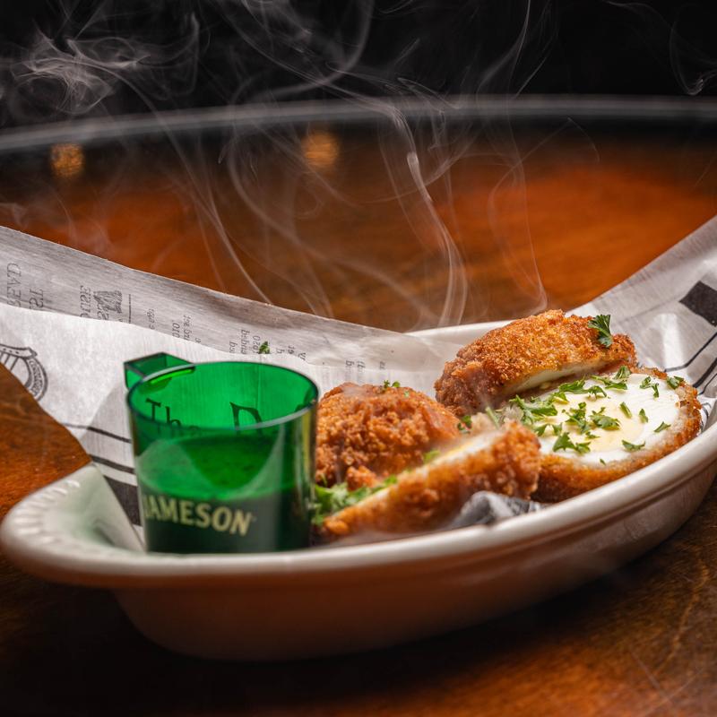Hard-boiled eggs, hand wrapped in ground sausage, breaded and deep-fried. Served with Guinness mustard $10 | Half Order $6