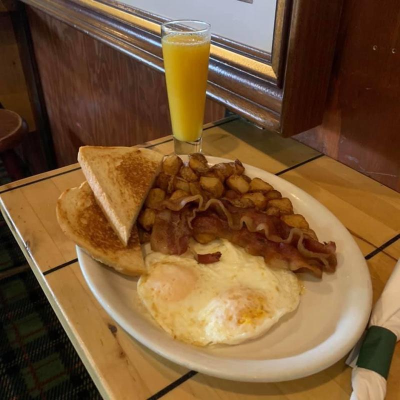 2 eggs cooked to order, 3 strips of applewood-smoked bacon, breakfast potatoes, and sourdough toast