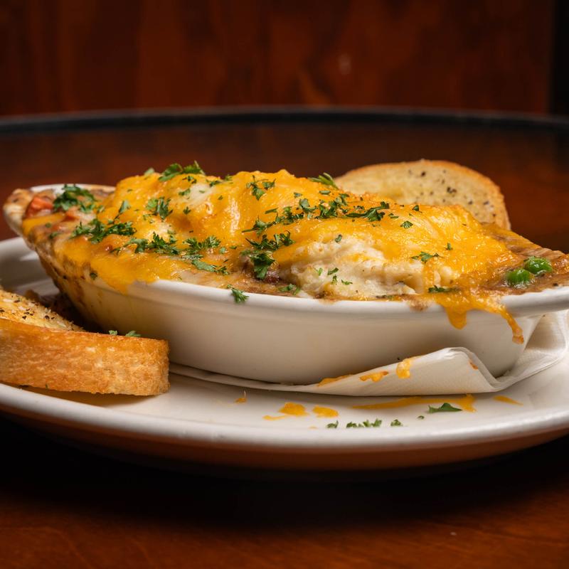 Sirloin, onions, peas, and carrots simmered in a Guinness-based beef broth topped with mashed potatoes and cheddar & jack