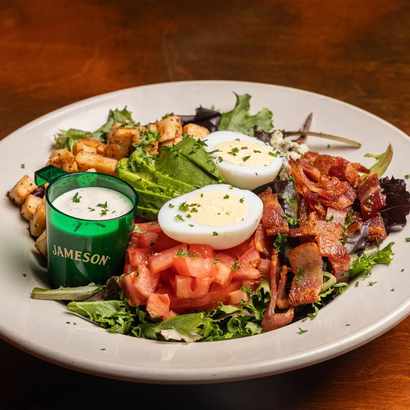 Hickory-smoked bacon, grilled chicken breast, sliced avocado, tomatoes, blue cheese crumbles, and a hardboiled egg on mixed greens