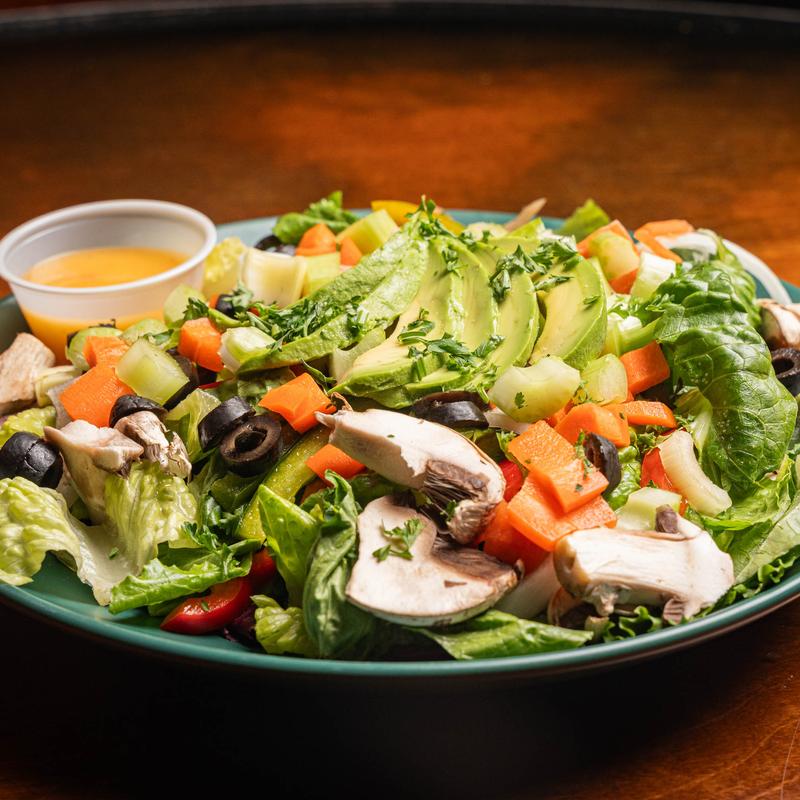 Cucumbers, carrots, sliced avocado, tomatoes, mushrooms, onion, peppers, and black olives on mixed greens with your choice of dressing. Add Crispy Chick'n $5