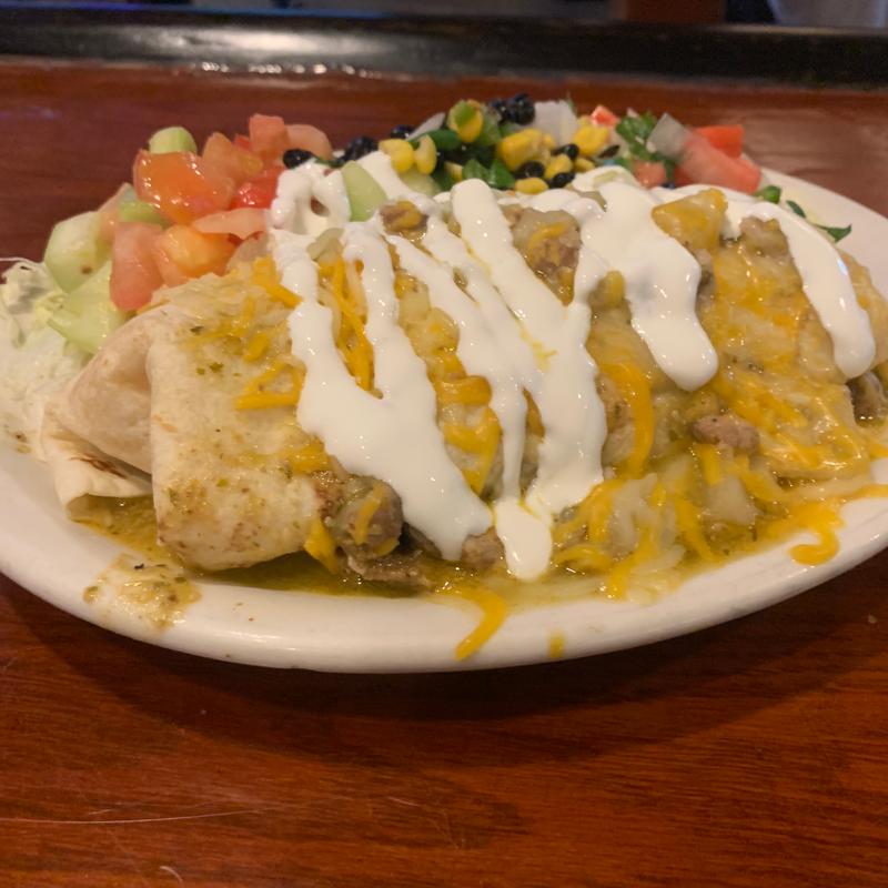 A huge Medrano-made pork & potato chile verde burrito topped with more chile verde, melted cheddar & jack, crema Mexicana, and guacamole
