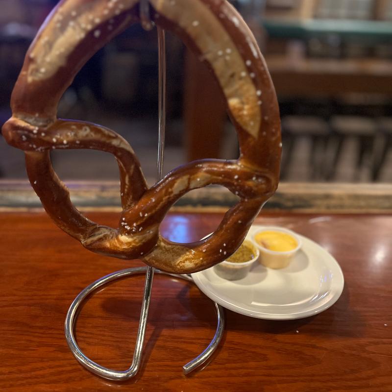 A huge salted pretzel served with Guinness mustard