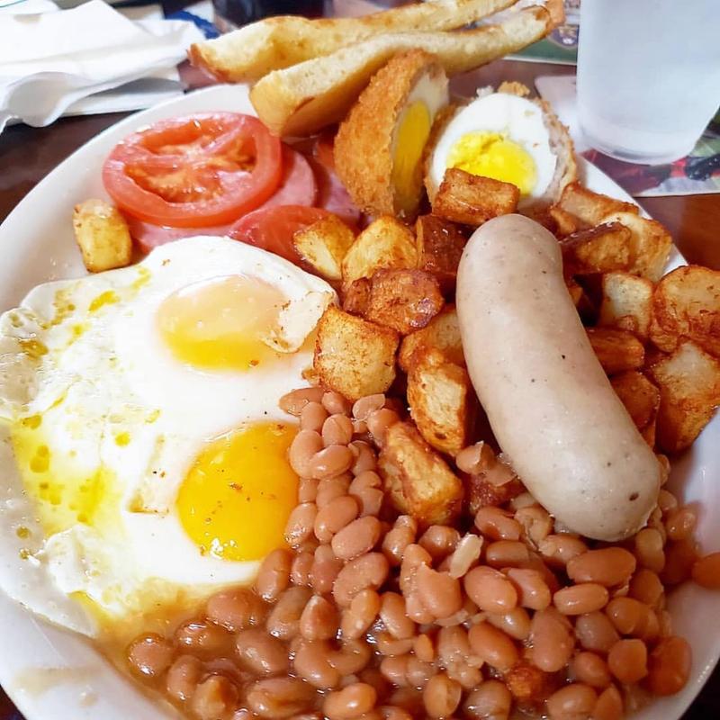 2 eggs, grilled bangers, Canadian bacon, tomatoes, Scotch egg, baked beans, breakfast potatoes, and sourdough toast
