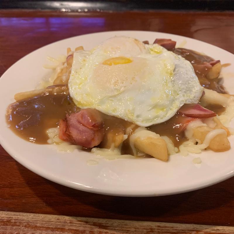 Our famous poutine fries topped with 2 eggs and Canadian bacon