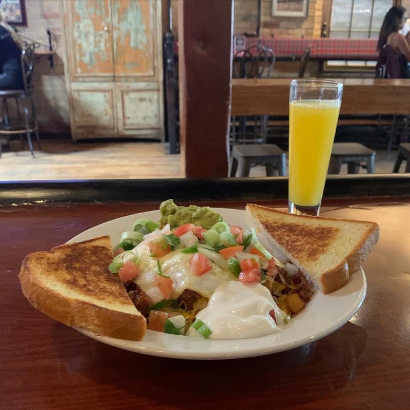 Bacon, scrambled eggs, avocado, pico de gallo, breakfast potatoes, and chipotle crema on grilled corn tortillas. Served with a side of house-made salsa