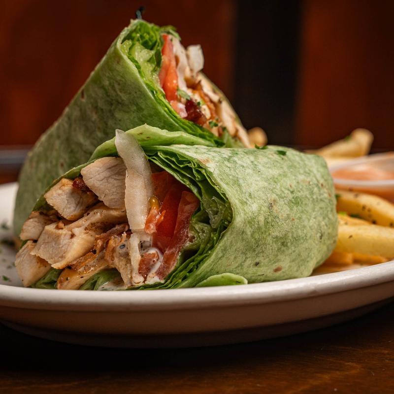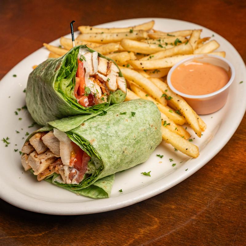 Grilled chicken breast, hickory-smoked bacon, avocado, lettuce, tomato, onion, and ranch wrapped in a spinach tortilla and served with fries