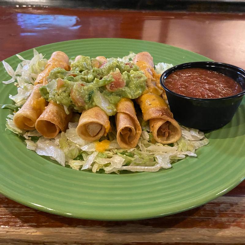 5 hand rolled tacos filled with grilled chicken breast topped with cheddar, guacamole, and salsa