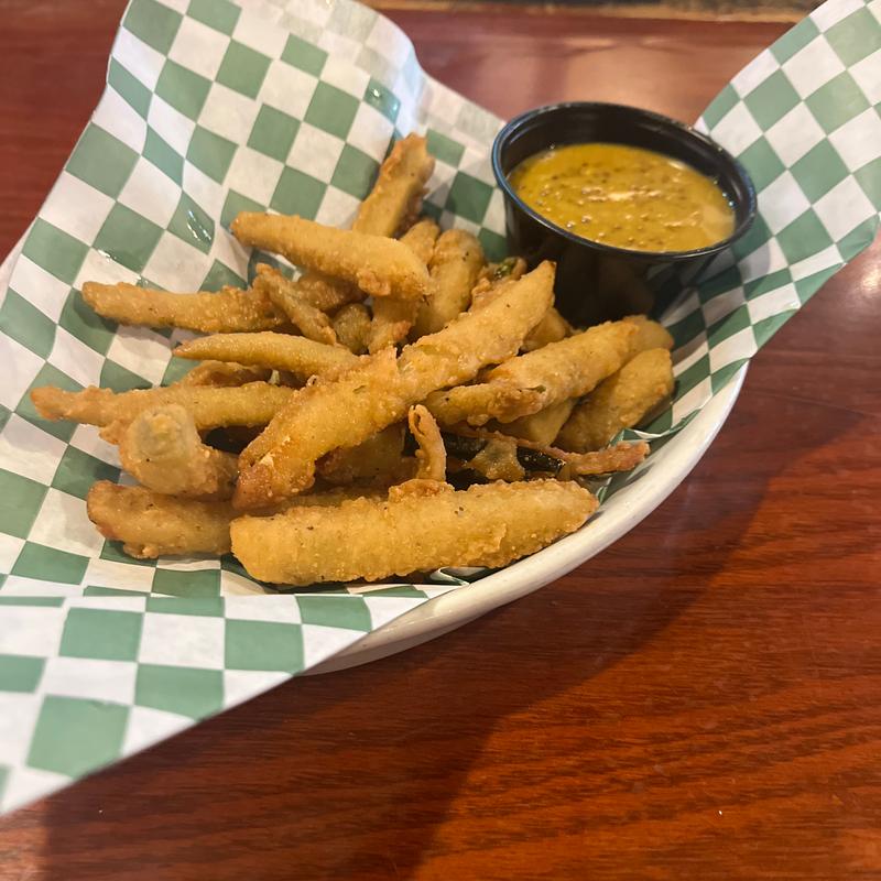 Beer-battered Mount Olive dill pickles with Guinness mustard sauce