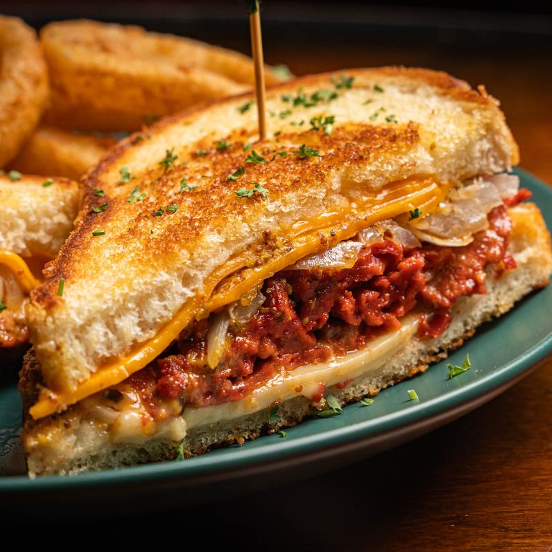 Vegan Daddy corned beef, caramelized onions, cheddar & Swiss, garlic aioli, and Guinness mustard on grilled sourdough