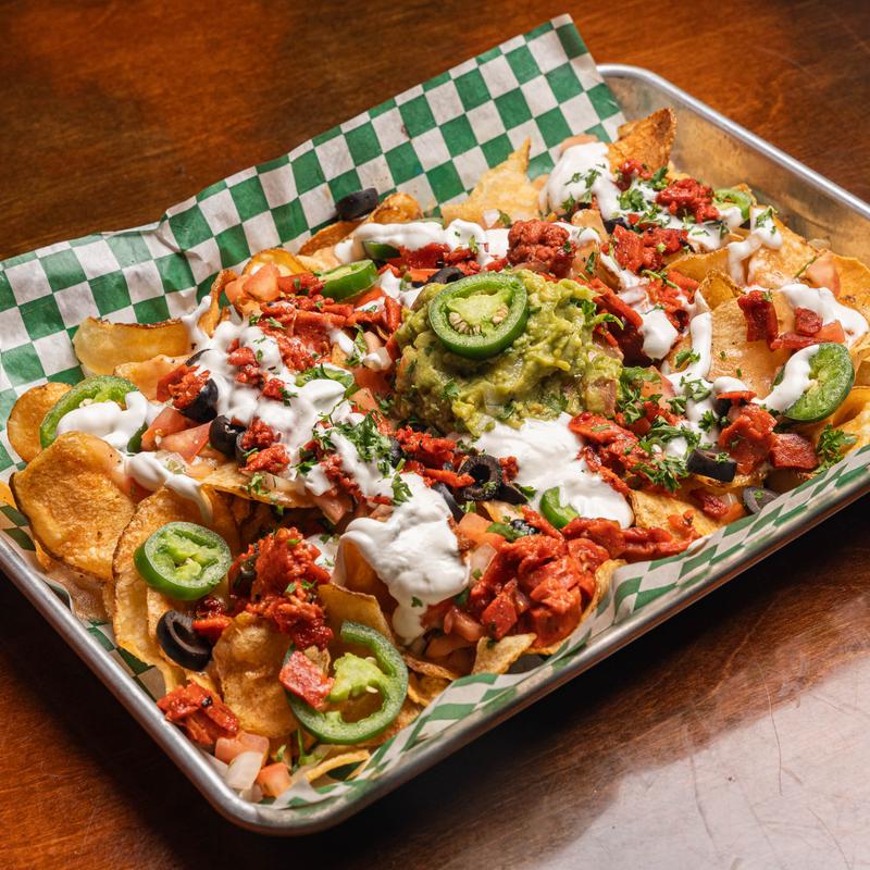 Vegan Daddy Corned Beef, cheddar and jack cheese, sour cream, pico de gallo, guacamole, and fresh jalapeños on fresh made kettle chips
