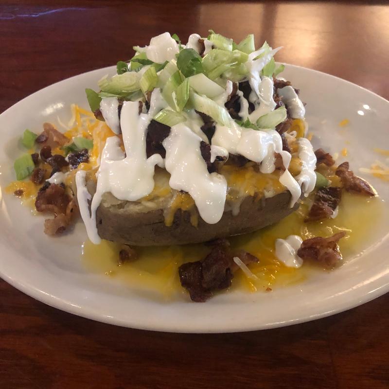 A huge baked Idaho spud filled with butter and topped with sour cream, cheddar cheese, bacon and green onions
