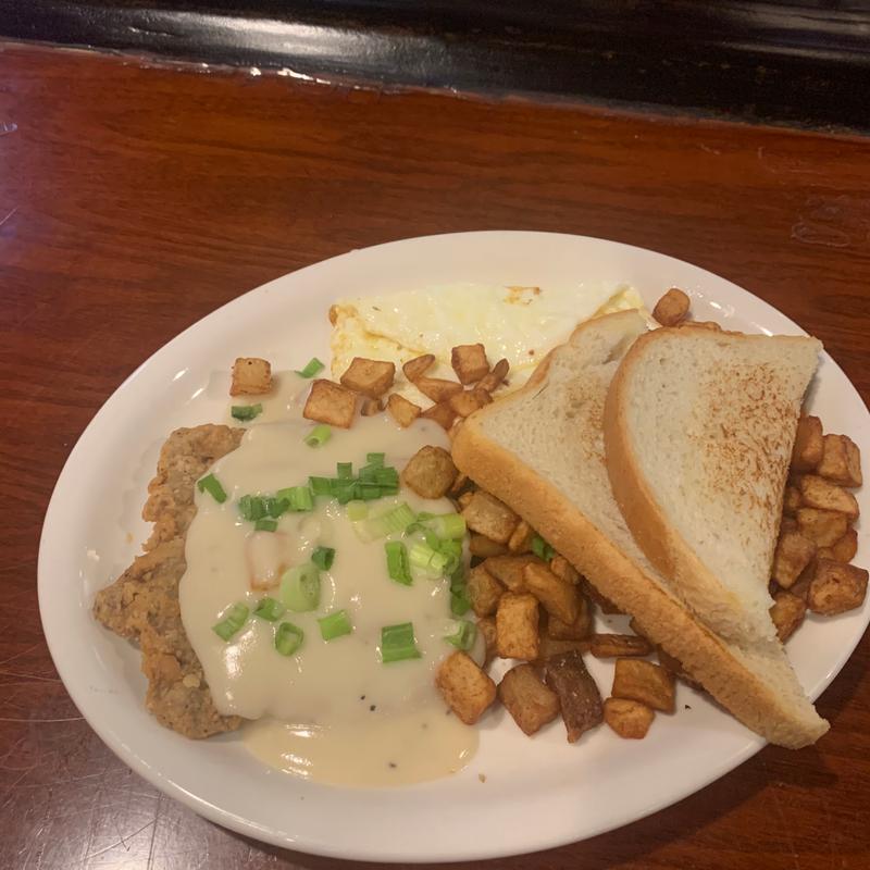 Half-pound Angus beef smothered in sausage & herb country gravy with 2 eggs, breakfast potatoes, and sourdough toast