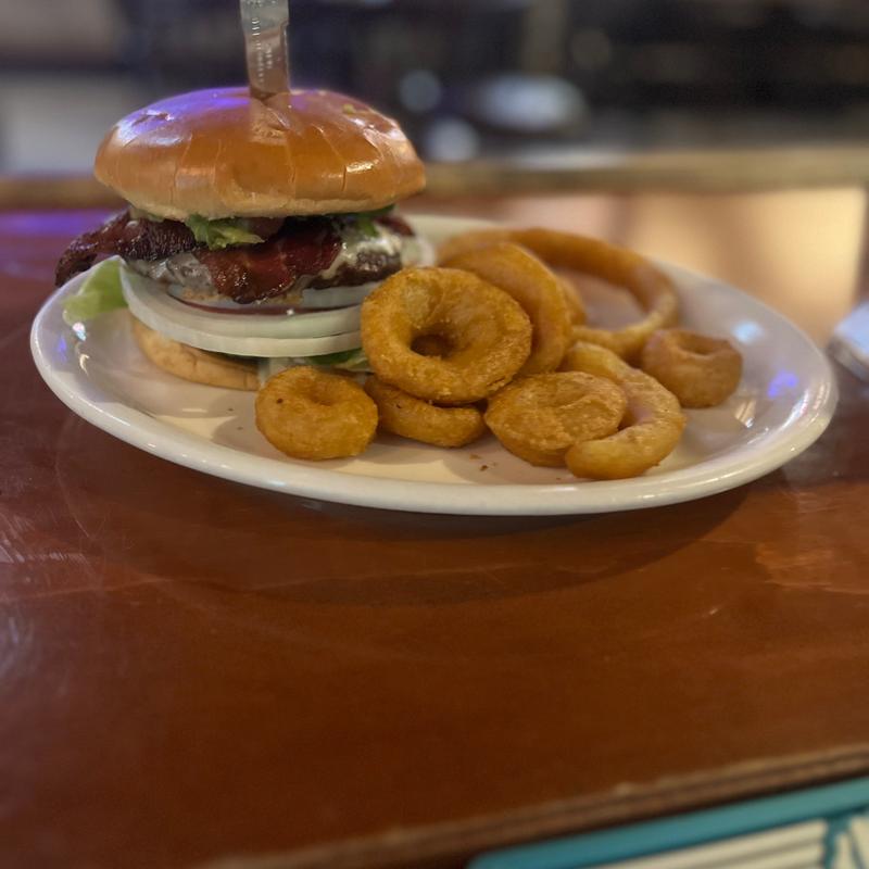 Bacon, cheddar, onion rings, and BBQ sauce*