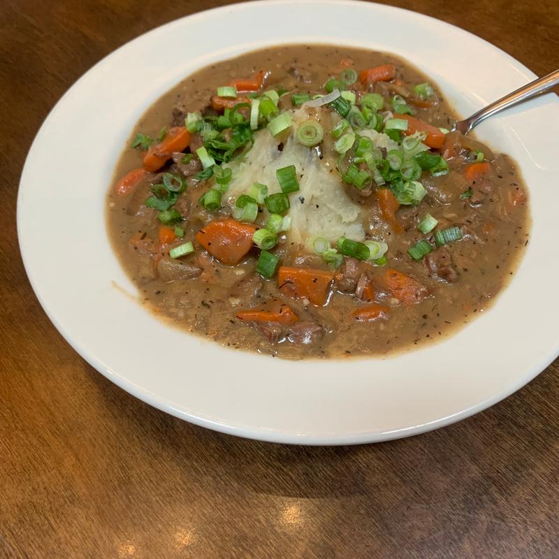 Sirloin, onions, peas, and carrots simmered in a Guinness-based beef broth topped with mashed potatoes and cheddar & jack
