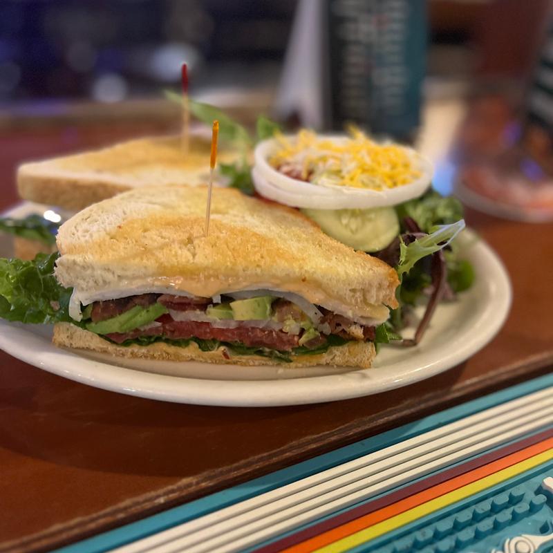 Sliced turkey breast, hickory-smoked bacon, Swiss, avocado, tomato, onion, and lettuce with aioli on toasted sourdough
