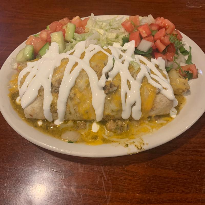 A huge Medrano-made pork & potato chile verde burrito topped with more chile verde, melted cheddar & jack, crema Mexicana, and guacamole