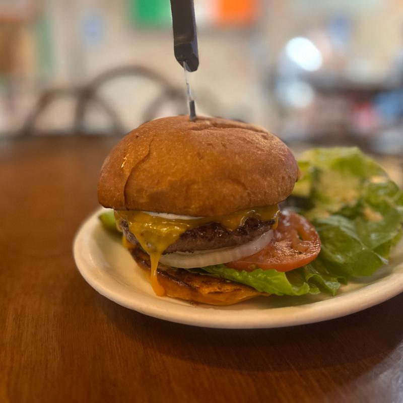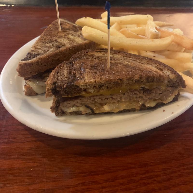 Beyond Burger, grilled onions, cheddar and Swiss w/thousand island on grilled marble rye.